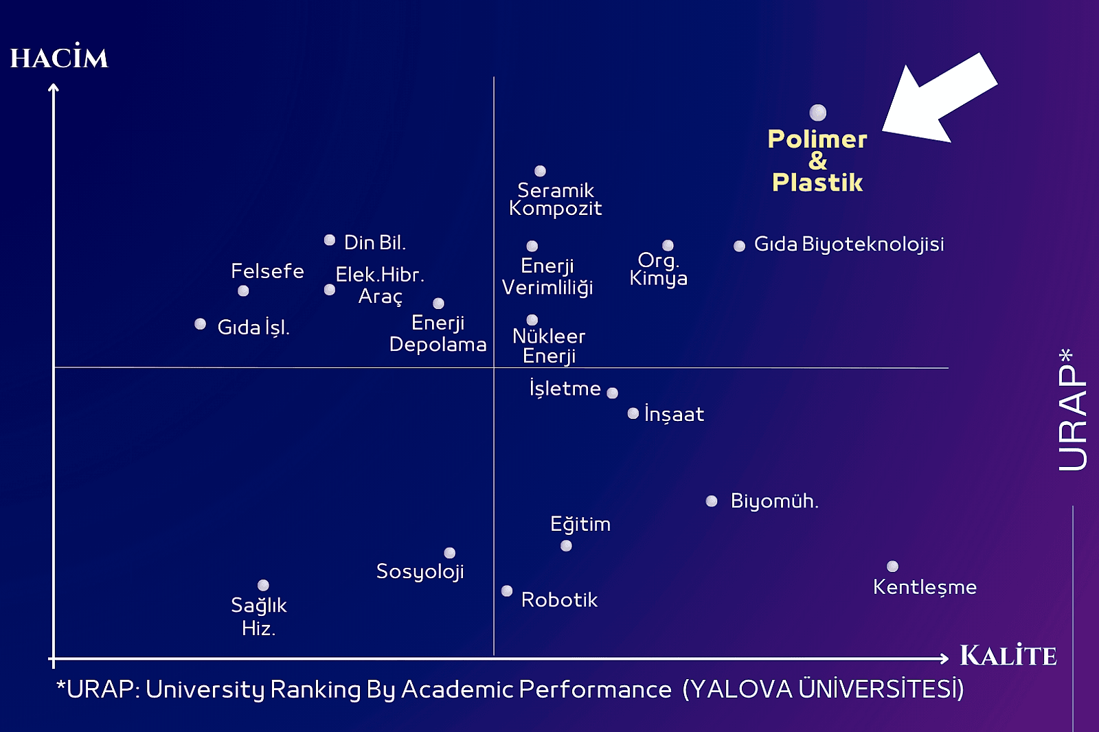 Malzeme-Polimer ve Plastikler alanında üniversitemiz ülkemizdeki diğer üniversitelerle kıyaslandığında ilgili alanda Polimerler Malzeme Mühendisliği Bölümünün büyük katkısıyla 1.Bölge’de kendine yer bulmuştur. Böylelikle yapılan çalışmaların kalitesi ve sayısı açısında ülkemizin köklü ve saygın üniversiteleri ile yarışır durumda olduğunu ve hatta birçok üniversitenin önünde yer aldığı görülmektedir. Ortadoğu Teknik Üniversitesi, URAP (University Ranking By Academic Performance) tarafından hazırlanan ve akademik performansı en yüksek olan 3 bin üniversiteyi sıralayan 2022-2023 dünya üniversiteleri sıralamasında Yalova Üniversitesi, büyük oranda Polimerler Malzeme Mühendisliği Bölümünün yaptığı akademik çalışmalarla “Polimer Bilimi” alanında dünyada ilk 300 üniversite arasında yer almıştır.